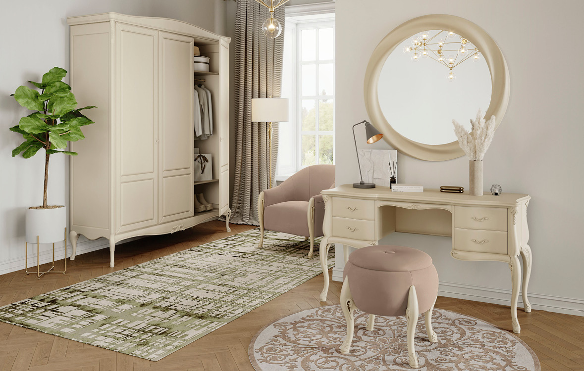 Con colori come il moka, il pesca, il blu, il cipria opaco e l'accostamento di foglia oro e argento, il design esclusivo di ogni pezzo sboccia in un fascino unico e distintivo. Le essenze di legno si fondono armoniosamente con queste tonalità, creando atmosfere romantiche e sofisticate.